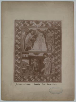 Opis fotografii:Recto kartonu: pieczęć „APARAT HISTORYI SZTUKI / UNIWERSYTETU JAGIELLOŃSKIEGO”; adnotacja atramentem „Gniezno – katedra. Kodeks t.zw. [!] kruszwicki”; adnotacja ołówkiem [sygn.] „IHSUJ P 001894”. Verso kartonu: pieczęć „APARAT HISTORYI SZTUKI / UNIWERSYTETU JAGIELLOŃSKIEGO / [nr inw.] 1634”; adnotacje ołówkiem: „z Kruszwicy. Gniezno”, „Chrzest i kuszenie Chrystusa”. Publ.: Verzeichnis der Kunstdenkmäler der Provinz Posen, t. 4: Die Kunstdenkmäler des Regierungsbezirks Bromberg, oprac. Julius Kohte, Berlin 1897, il. 94.