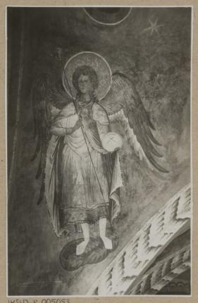 Opis fotografii:Recto tektury: adnotacja ołówkiem [sygn.] „IHSUJ P 005053”. Verso tektury: adnotacje ołówkiem: „Lublin / Kaplica zamkowa / fragment malowideł ruskich z początku XV w. / przedstawienie...”, „30”, „Sklepienie prezbiterium / stan po konserwacji / 1917”, „[...]ud. / [...]go U. J. / [...]7”; naklejona etykieta „INSTYTUT HISTORII SZTUKI / UNIWERSYTETU JAGIELLOŃSKIEGO / ARCHIWUM FOTOGRAFICZNE” wypełniona na maszynie: [Miejscowość] „LUBLIN”, [Powiat] „lubelski”, [Województwo] „lubelskie”, [Zabytek] „Kaplica zamkowa-fragment malowideł ruskich z początku XV w.”, [Przedmiot zdjęcia] „Przedstawienie anioła”; na etykiecie adnotacje ołówkiem: „8”, „30”. Publ.: M. Walicki, Malowidła ścienne kościoła św. Trójcy na zamku w Lublinie, „Studia do Dziejów Sztuki w Polsce”, 3, 1930, tabl. XVIII.
