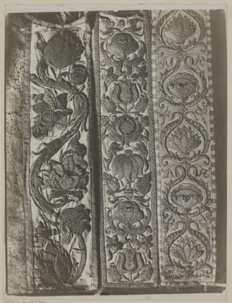 Odbitka z tego samego negatywu co sygn. IHSUJ P 005343. Recto kartonu: adnotacja atramentem „Łask”; adnotacje ołówkiem: [sygn.] „IHSUJ P 005344”, „w. XVII”. Verso kartonu: pieczęć „Z HS UNIW. JAGIELL.”; pieczęć „U”; adnotacja atramentem „7530 Kolumny haftowane z ornatów – Kolegiata”; adnotacje ołówkiem: [przekreślona] „75”, „21”; naklejona etykieta „INSTYTUT HISTORII SZTUKI / UNIWERSYTETU JAGIELLOŃSKIEGO / ARCHIWUM FOTOGRAFICZNE” wypełniona na maszynie: [Miejscowość] „ŁASK”, [Powiat] „łaski”, [Województwo] „łódzkie”, [Zabytek] „kościół parafialny”, [Przedmiot zdjęcia] „ornat haftowany”; adnotacje ołówkiem: „21”, „13”.