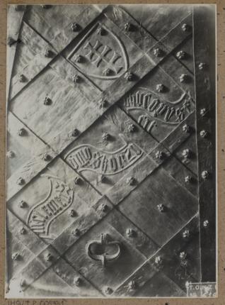 Recto odbitki: z negatywu adnotacja „T. O. N. Z. [...] / No. 619”. Recto tektury: adnotacja ołówkiem [sygn.] „IHSUJ P 005841”. Verso tektury: naklejona etykieta „ZAKŁAD HISTORII SZTUKI / UNIWERSYTETU JAGIELLOŃSKIEGO / ARCHIWUM FOTOGRAFICZNE” wypełniona na maszynie: [Miejscowość] „Moskrzew” [poprawione ołówkiem na „Moskorzew”], [Powiat] „włoszczowski”, [Województwo] „kieleckie”, [Wymiary kliszy] „Biuro”, [Miejsce przechow. kliszy] „Biuro inwentaryzacji Zabytków”, [Określenie zabytku] „Kościół parafialny. / Drzwi okute żelazem / 1380.”. Publ.: A. Bochnak, J. Pagaczewski, Polskie rzemiosło artystyczne wieków średnich, Kraków 1959, il. 149.