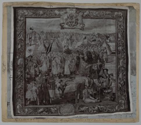 Tytuł:Przywiezienie rannego Michała Krzyczewskiego przed Janusza Radziwiłła po bitwie pod Łojowem 1 sierpnia 1649, tapiseria, fragment