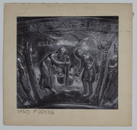Tytuł:Kielich tzw. Królewski (vel drugi kielich Dąbrówki) z opactwa kanoników regularnych w Trzemesznie, czasza, Elizeusz wydobywający z Jordanu zatopioną siekierę