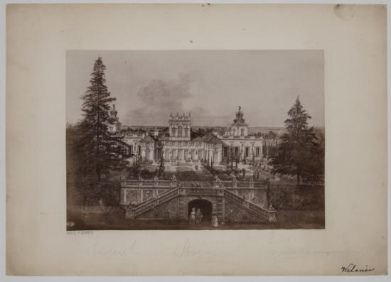 Opis fotografii:Recto kartonu: adnotacja atramentem „Wilanów”; adnotacje ołówkiem: „Eu”, [sygn.] „IHSUJ P 009949”, „Zamek w [nieczytelne]”, „15.0 x 21.5 [nieczytelne] 60 raster”, „(7 siatek) podany nowy format / [nieczytelne]”. Verso kartonu: pieczęć „APARAT HISTORYI SZTUKI [UNIWERSYTETU JAGIELLOŃSKIEGO] [nr inw.] 7392”; pieczęć „Z / HS / UNIW. / JAGIELL.”; adnotacje atramentem: [nr inw.] „7392”, „Im Auftrage und mit Bewilligung von A.N. Benois”; adnotacja ołówkiem „21”; naklejona etykieta „INSTYTUT HISTORII SZTUKI / UNIWERSYTETU JAGIELLOŃSKIEGO / ARCHIWUM FOTOGRAFICZNE” wypełniona na maszynie: [Miejscowość] „Wilanów”, [Powiat] „Warszawa / ''”, [Województwo] „''”, [Zabytek] „pałac”, [Przedmiot zdjęcia] „Widok pałacu wg obrazu / Canaletta”.