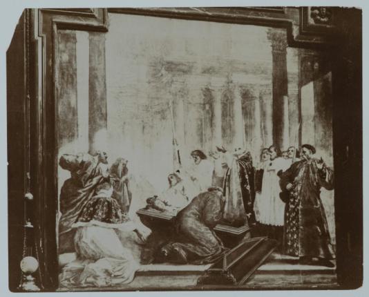 Opis fotografii:Reprodukcja fotografii S. F. Fleury'ego wykonana przez Władysława Zahorskiego (?). Verso odbitki: pieczęć „Z / HS / UNIW. / JAGIELL.”; adnotacja ołówkiem [sygn.] „IHSUJ P 018281”. Na luźnej kartce papieru: pieczęć „APARAT HISTORYI SZTUKI UNIWERSYTETU JAGIELLOŃSKIEGO [nr inw.] 7639”; adnotacje atramentem: [nr inw.] „7639”, „Katedra wileńska / Kaplica św. Kazimierza / Fresk Piotra de Ry – Dankerte z pocz. XVIII w. / Przeniesienie zwłok św. Kazimierza”; adnotacje ołówkiem: [sygn.] „IHSUJ P 018281”, „31”, „Wedle Kopery Dzieje mal. T. II del Bene jest autorem”.
