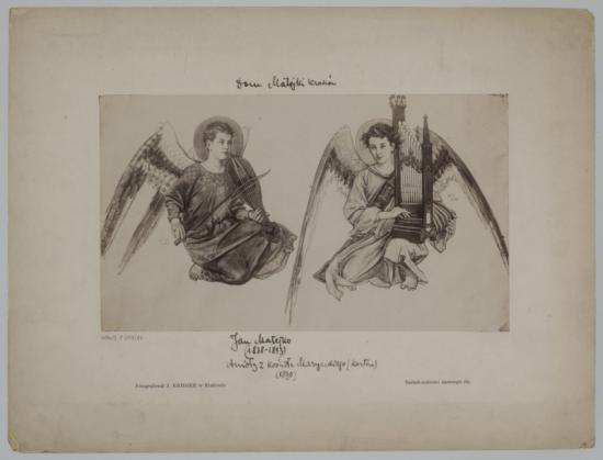 Recto kartonu: druk: „Fotografował J. KRIEGER w Krakowie.”, „Naśladownictwo zastrzega się.”; adnotacje atramentem: „Dom Matejki Kraków”, „Jan Matejko / (1838-1893) / Anioły z kościoła Maryackiego (karton) / (1890)”; adnotacja ołówkiem [sygn.] „IHSUJ P 019171”. Verso kartonu: pieczęć „Kolekcya / Prof. Dra J. Mycielskiego / Nr [dopisek ołówkiem „868”; pieczęć trójkątna „Z / HS / UNIW. / JAGIELL.”; adnotacja kredką i ołówkiem „25 x”.