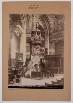 Opis fotografii:Odbitka z tego samego negatywu co sygn. IHSUJ P 012885. Recto odbitki: adnotacje z negatywu: „159 Ambona w kościele N. Panny Maryi. z XVII wieku”, „I. KRIEGER w Krakowie”. Recto kartonu: adnotacje na maszynie: „KRAKÓW / Kościół N.P.M.”, „221/0.”; adnotacja ołówkiem [sygn.] „IHSUJ P 012886”. Verso kartonu: pieczęć „URZĄD WOJEWÓDZKI KRAKOWSKI / WYDZIAŁ KULTURY I SZTUKI / Oddział Muzeów i Ochrony Zabytków” wypełniona atramentem: [Nr kliszy/pomiaru] „10148”, [Miejscowość] „Kraków”, [Zabytek] „kość. N.M.P. – ambona”.